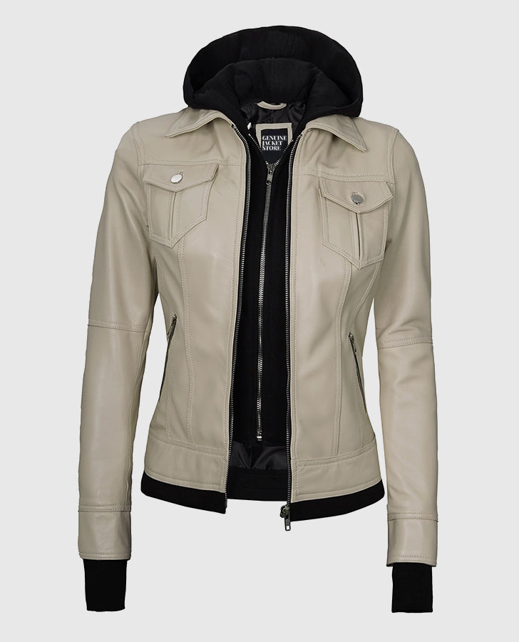Be the first to review “Women’s Beige Bomber Leather Jacket with Hood” Cancel reply