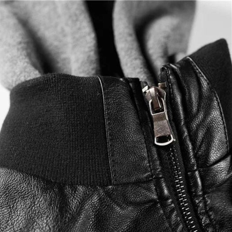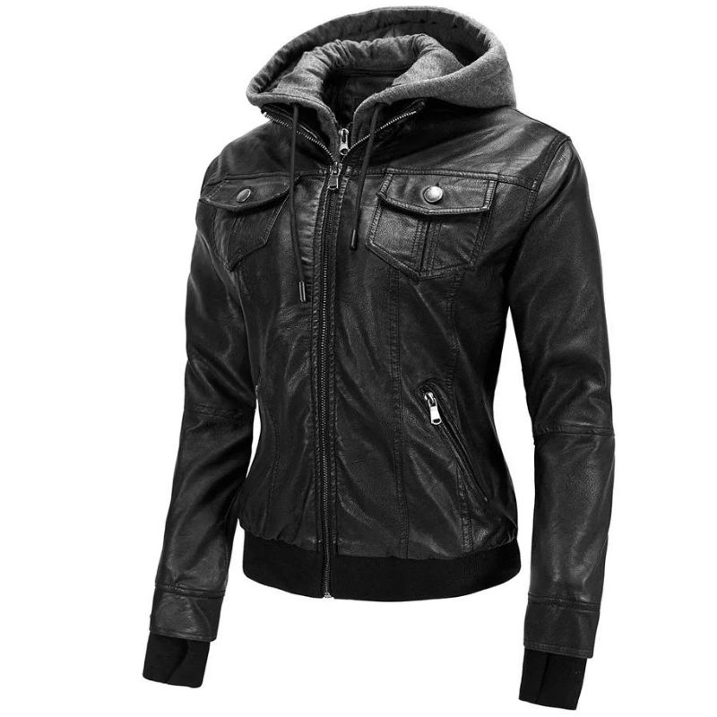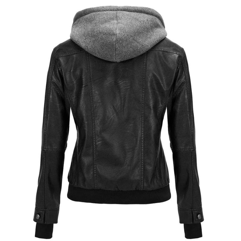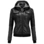 Black Hooded Leather Bomber Jacket with Removable Hood For Women’s