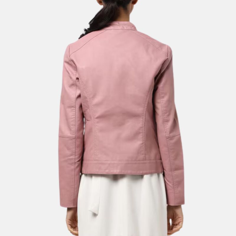 Rock a cool and classic look in our womens pink cafe racer leather jacket! Made from buttery soft 100% premium leather which makes it both comfortable and eye catching. The classic cafe racer style features a snap tab collar and a zipper closure. This womens pink leather jacket is perfect for adding a pop of pink to any outfit.
