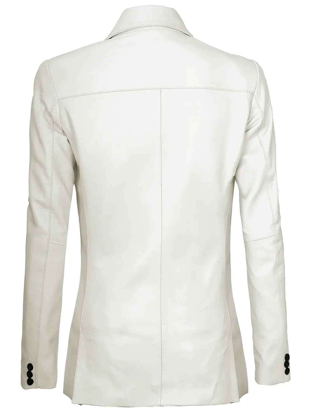 Upgrade your formal wardrobe with the Women’s White Two-Button Leather Blazer, a fusion of sophistication and refined style. Meticulously designed, this blazer features a classic white hue that adds versatility to your ensemble.